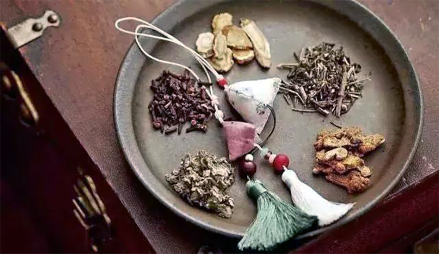 3、配香囊、懸艾草、纏絲符、飲雄黃:端午節(jié)小孩佩香囊,傳說有避邪驅(qū)瘟之意,實(shí)際是用于襟頭點(diǎn)綴裝飾。香囊內(nèi)有朱砂、雄黃、香藥,外包以絲布,清香四溢,再以五色絲線弦扣成索,作各種不同形狀,結(jié)成一串,形形色色,小巧可愛,現(xiàn)已成為一種普遍的工藝品。在中國某些南方城市,青年男女還用香囊來表達(dá)濃濃愛意。