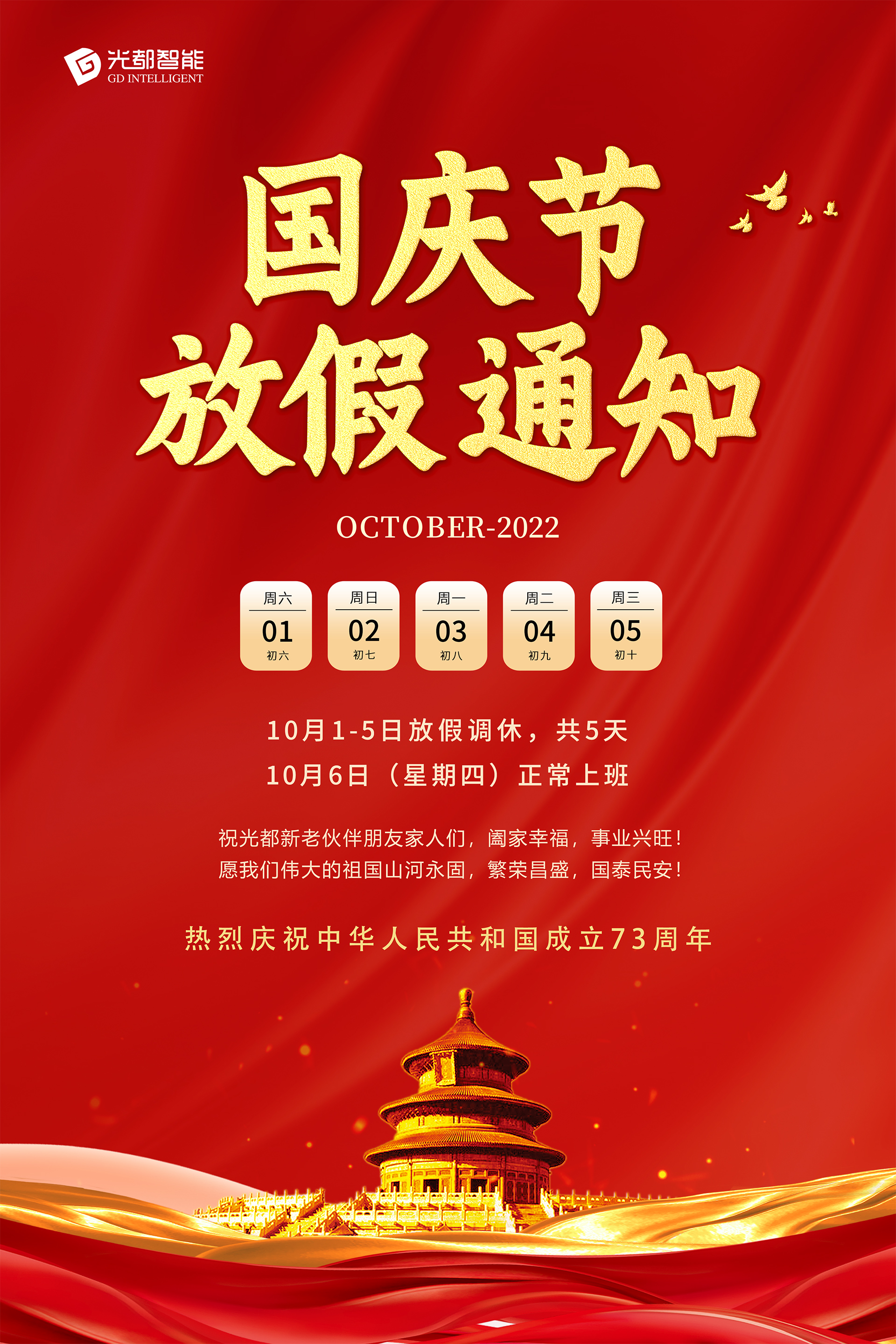 【盛世華誕/歡度國慶】慶祝中華人民共和國成立73周年!祝光都新老伙伴朋友家人們,闔家幸福,事業(yè)興旺,國慶快樂!愿偉大祖國山河永固,繁華昌盛,國泰民安!