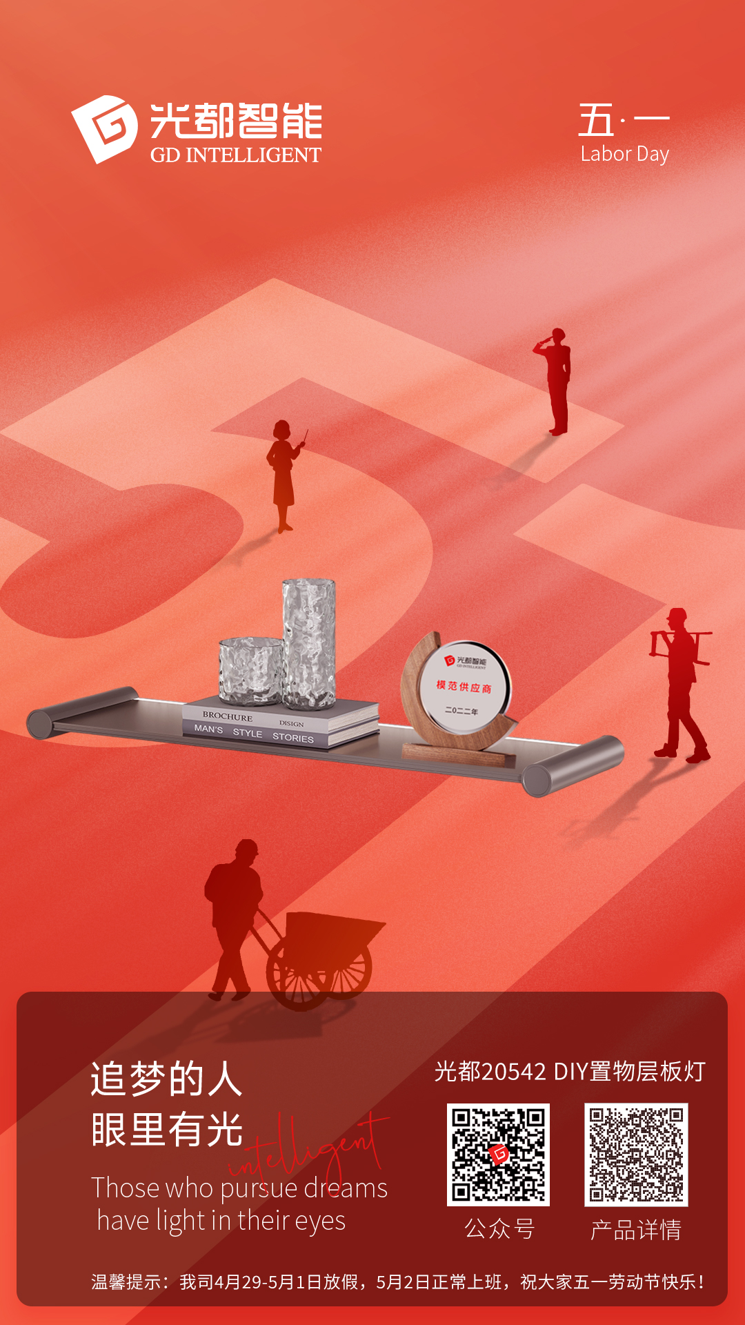 追夢的人,眼里有光; 勞動創(chuàng)造價值,勞動進步發(fā)展; 勞動無尚榮光,因為我們都熱愛勞動! 恭祝新老伙伴朋友家人們五一勞動節(jié)快樂! 溫馨提示:我司4月29-5月1日休假,5月2日正常上班,祝大家五一勞動節(jié)快樂!光都新品20542 DIY置物層板燈致敬勞動,五月優(yōu)費上樣!