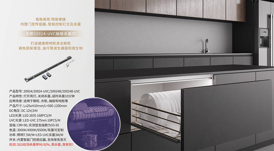 好燈光的定義:健康!經(jīng)歷過疫情三年的洗禮,人們把健康看的比任何時候都更為重要。光都20924-UVC抽屜殺菌燈,采用275nm專業(yè)UVC紫外線殺菌,通過SGS權(quán)威檢測,殺菌率高達99.92%,達到了醫(yī)療級效果,真殺菌,真有效。適用于櫥柜拉籃/調(diào)味籃/地柜收納,以及鞋柜/衣帽間/浴室柜等場景。開門照明,關(guān)門滅燈并啟動殺菌,延時殺菌10分鐘(多次抽拉可累積殺菌時間),人在的時候不會殺菌,保證使用環(huán)境安全,確保對用戶無害。高端定制好元素,健康家居好幫手!