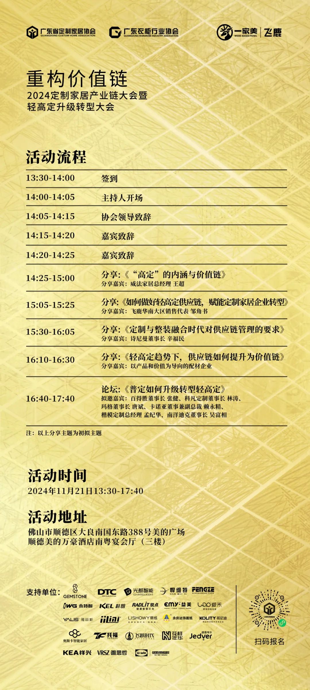 “重構(gòu)價值鏈”——2024定制家居產(chǎn)業(yè)鏈大會暨輕高定升級轉(zhuǎn)型大會將于11月21日在廣東佛山順德美的萬豪酒店舉行。